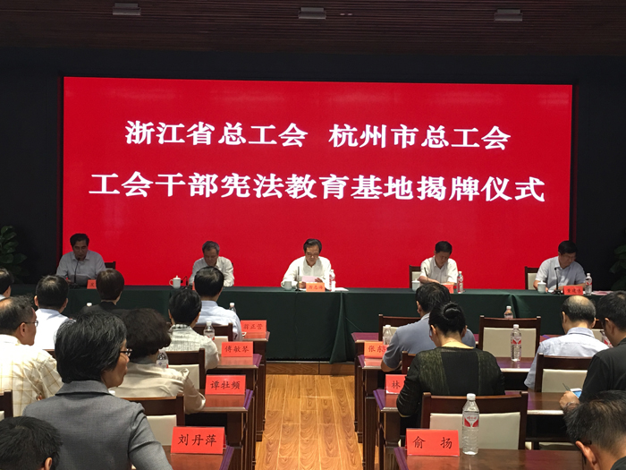 5月31日下午,在“五四宪法”历史资料陈列馆(栖霞岭馆区),省人大常委会原副主任、省总工会主席厉志海,杭州市人大常委会副主任、杭州市总工会主席郑荣胜,共同为“工会干部宪法教育基地”揭牌。